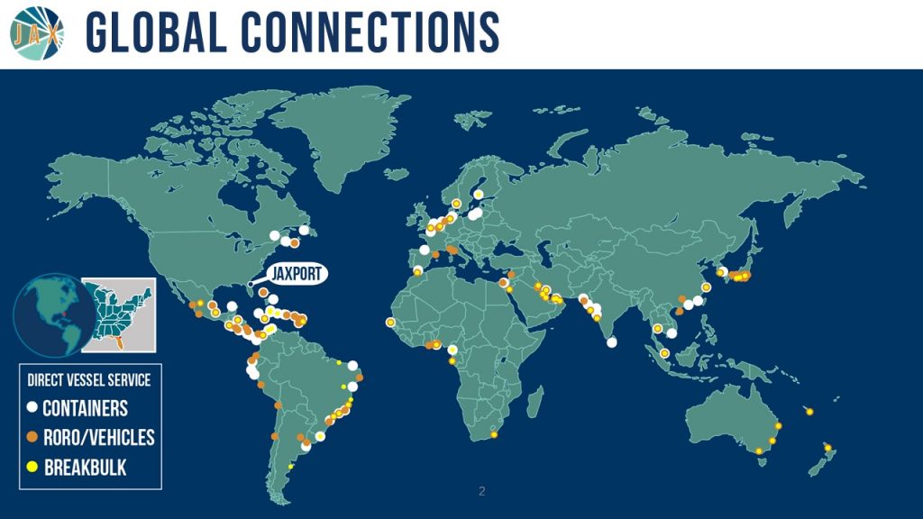 “We are excited to see the updates this year to the global ocean carrier alliances,” said JAXPORT Chief Commercial Officer Robert Peek. “Our carrier partners have been supportive, offering shippers global access to markets through JAXPORT.”